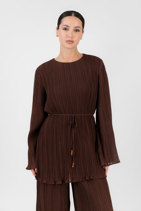 Plisse Tunic with Waist Tie - Brownie