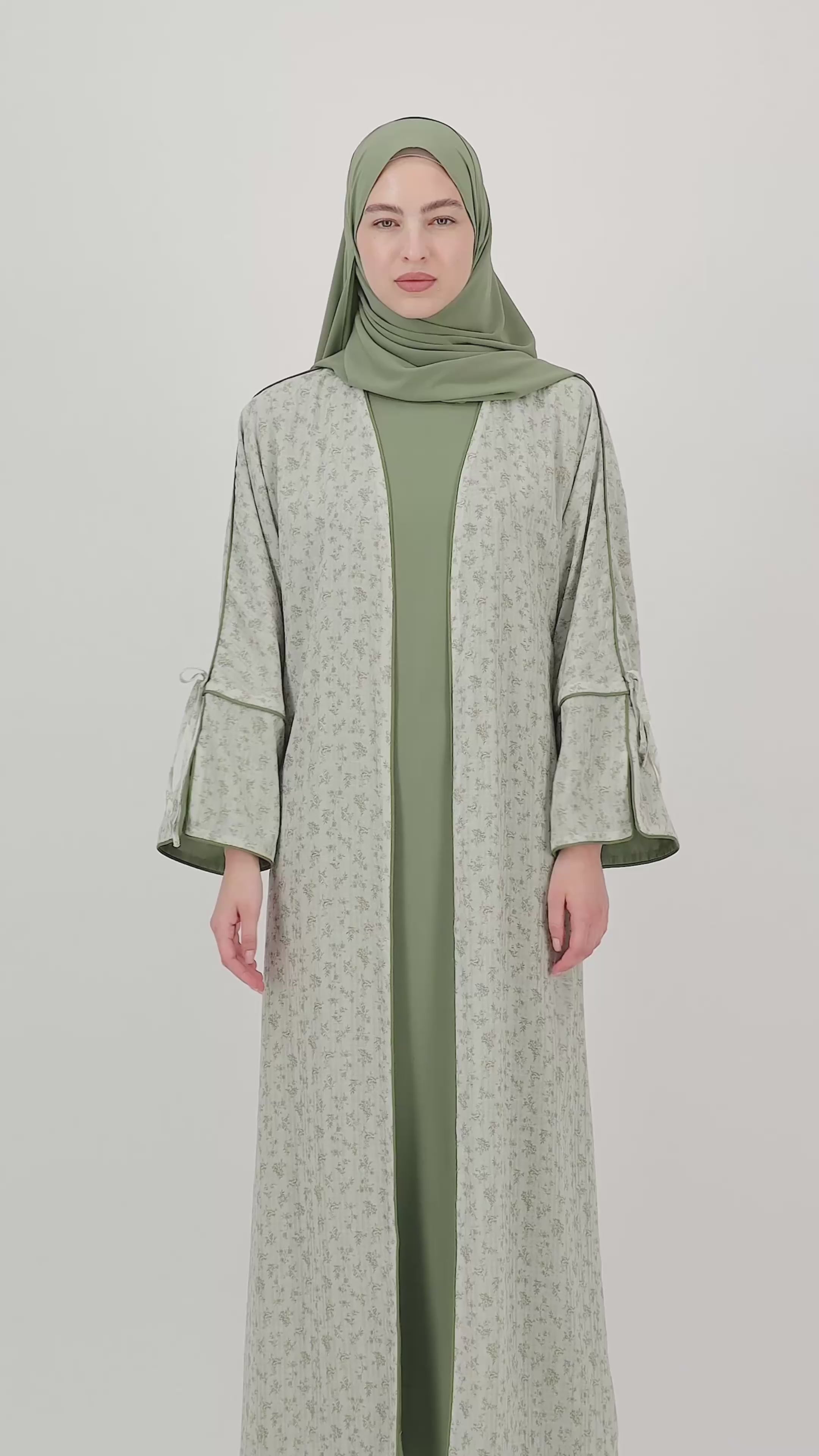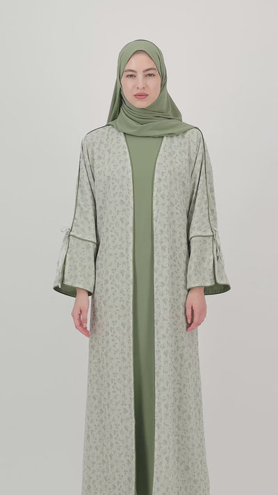 A beautifully coordinated three-piece abaya set featuring a floral printed outer abaya finished with contrast piping throughout the sleeves and sides. The oversized sleeves are detailed with a subtle slit and a delicate bow. This set includes a perfectly matching short sleeve inner dress with a back zipper for easy wear, along with a matching chiffon hijab to complete the look.