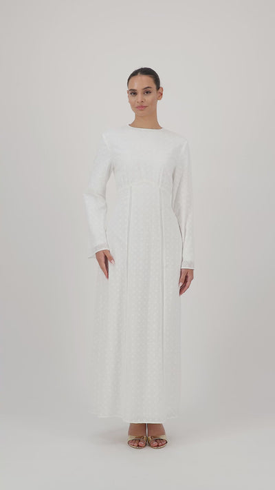 A refined white dress featuring intricate embroidery with delicate cutout detailing. Designed with a high waistline for a lengthened silhouette, along with a customizable waist tie in the back. Fully lined and opaque, making it a go-to maxi dress for all occasions.